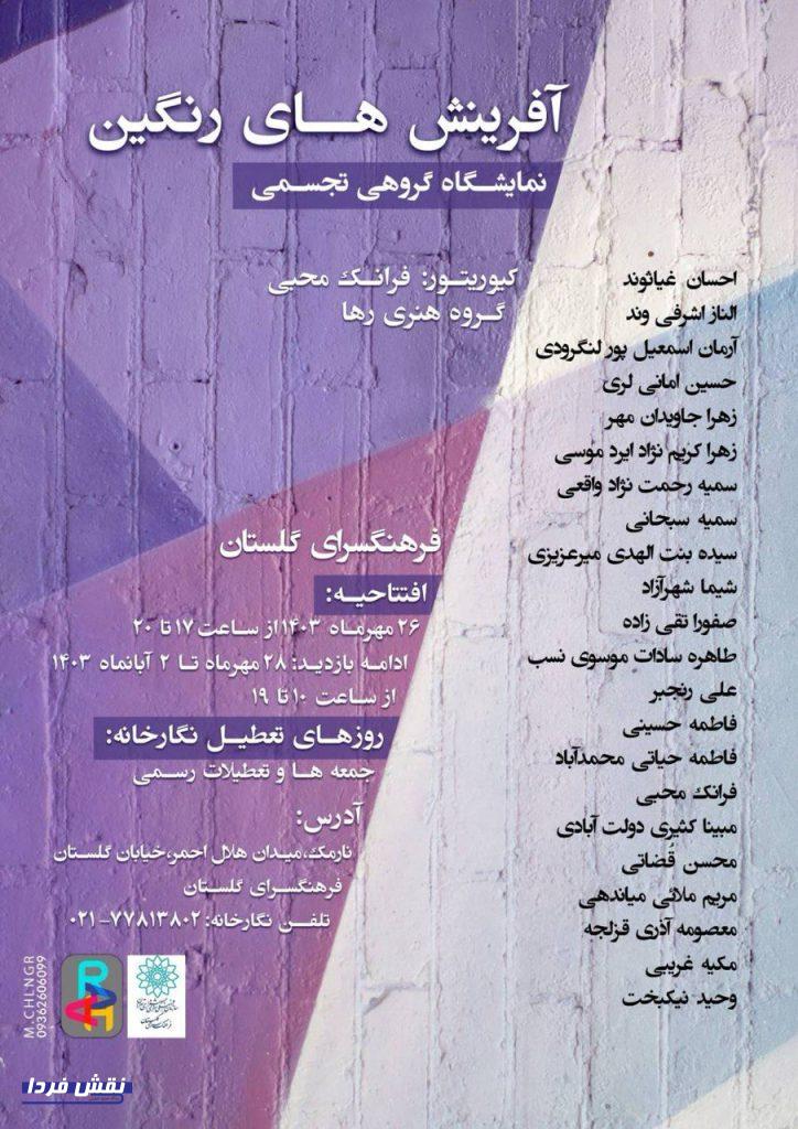 مراسم افتتاحیه نمایشگاه گروهی «آفرینشهای رنگین» برگزار شد و مخاطبان میتوانند از امروز تا 2 آبانماه از ساعت 10 الی 19 جهت بازدید از آثار و نمایشگاه به نگارخانه گلستان مراجعه کنند.