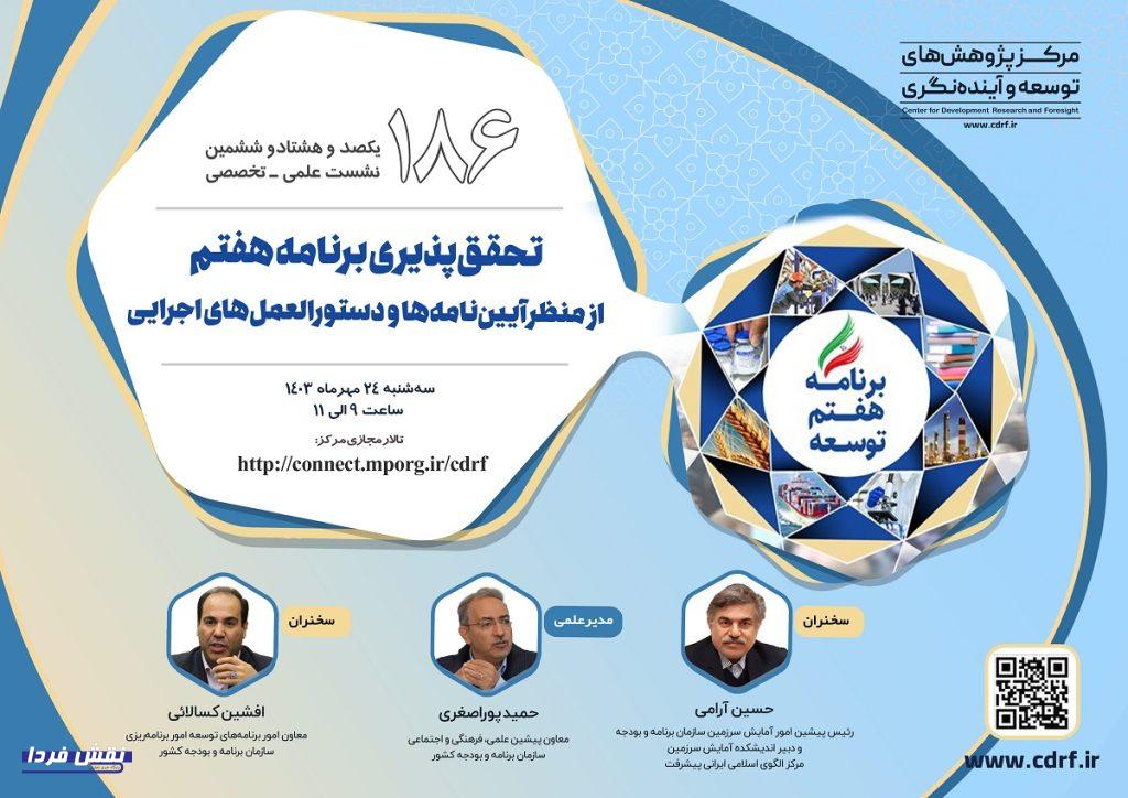 به گزارش نقش فردا به نقل از مركز روابط عمومي و امور بينالملل سازمان برنامه و بودجه كشور؛ يكصد و هشتاد و ششمين نشست علمي تخصصي مركز پژوهشهاي توسعه و آيندهنگري كه از ساعت ۹ تا ۱۱ روز سهشنبه ۲۴ مهرماه به صورت مجازي برگزار ميشود، به موضوع «تحققپذيري برنامه هفتم از منظر آييننامهها و دستورالعملهاي اجرايي» اختصاص دارد.