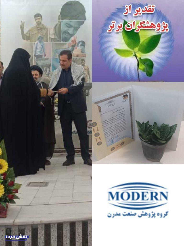 به گزارش نقش فردا به نقل از روابط عمومی پژوهش صنعت مدرن ، سرکار خانم حسینی، کارشناس محیط زیست شرکت مدرن، بهعنوان پژوهشگر برتر در عرصههای علمی و فناوری شهرستان آشتیان از سوی سپاه پاسداران مورد تقدیر و تشکر قرار گرفتند.