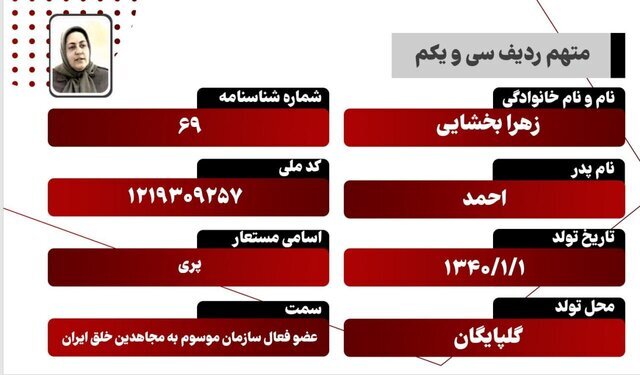 به گزارش نقش فردا به نقل از خبرآنلاین، زهرا بخشایی فرزند احمد متهم ردیف سیویکم پرونده است. او در سال ۱۳۶۰، به دلیل عضویت و همکاری با گروهک تروریستی منافقین دستگیر و به یک سال حبس محکوم میشود.